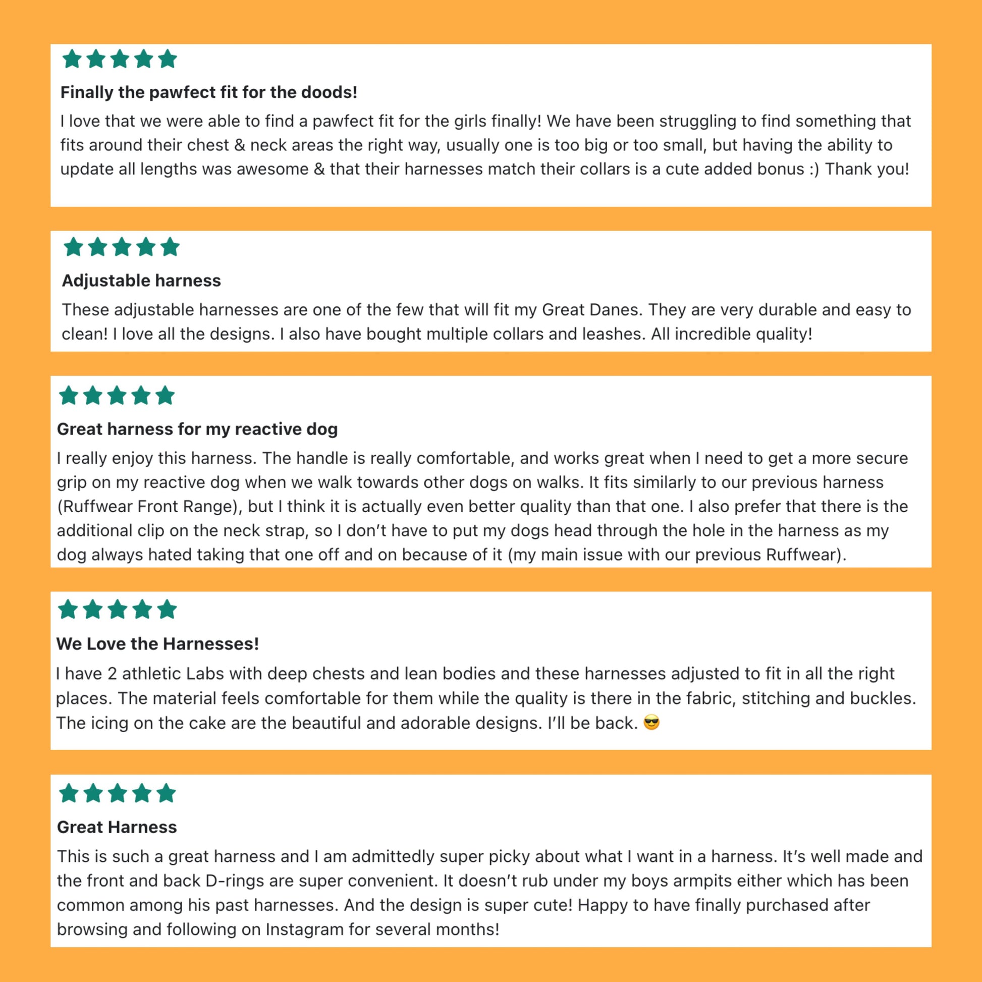 I love that we were able to find a pawfect fit for the girls finally! We have been struggling to find something that fits around their chest & neck areas the right way, usually one is too big or too small, but having the ability to update all lengths was awesome & that their harnesses match their collars is a cute added bonus :) Thank you!