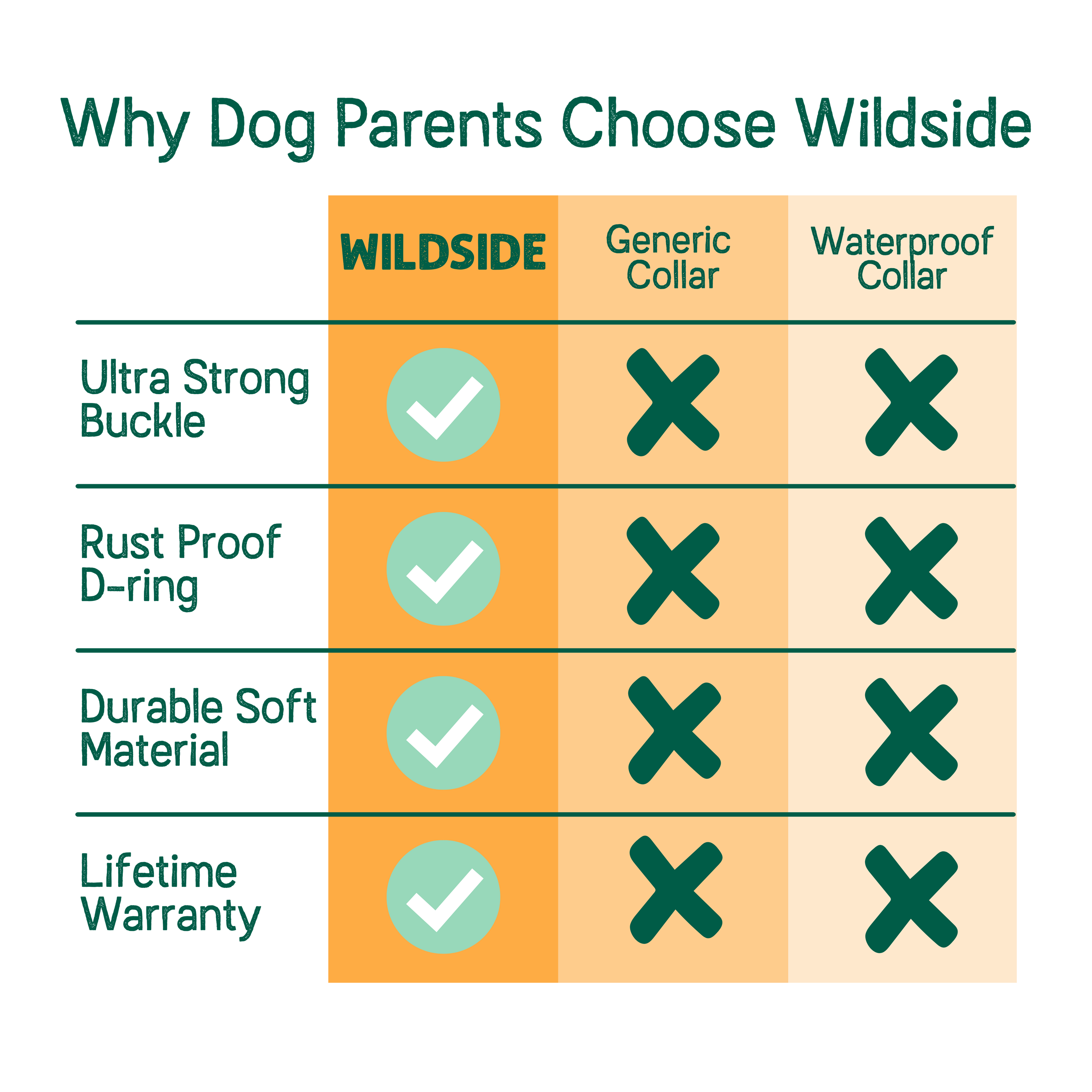 Wildside collars are different. Our soft, quick-drying polyester webbing moves naturally with your dog for all-day comfort, and our 100% rust-proof stainless-steel hardware never corrodes — no matter how many swims, rainy walks, or beach days you share.