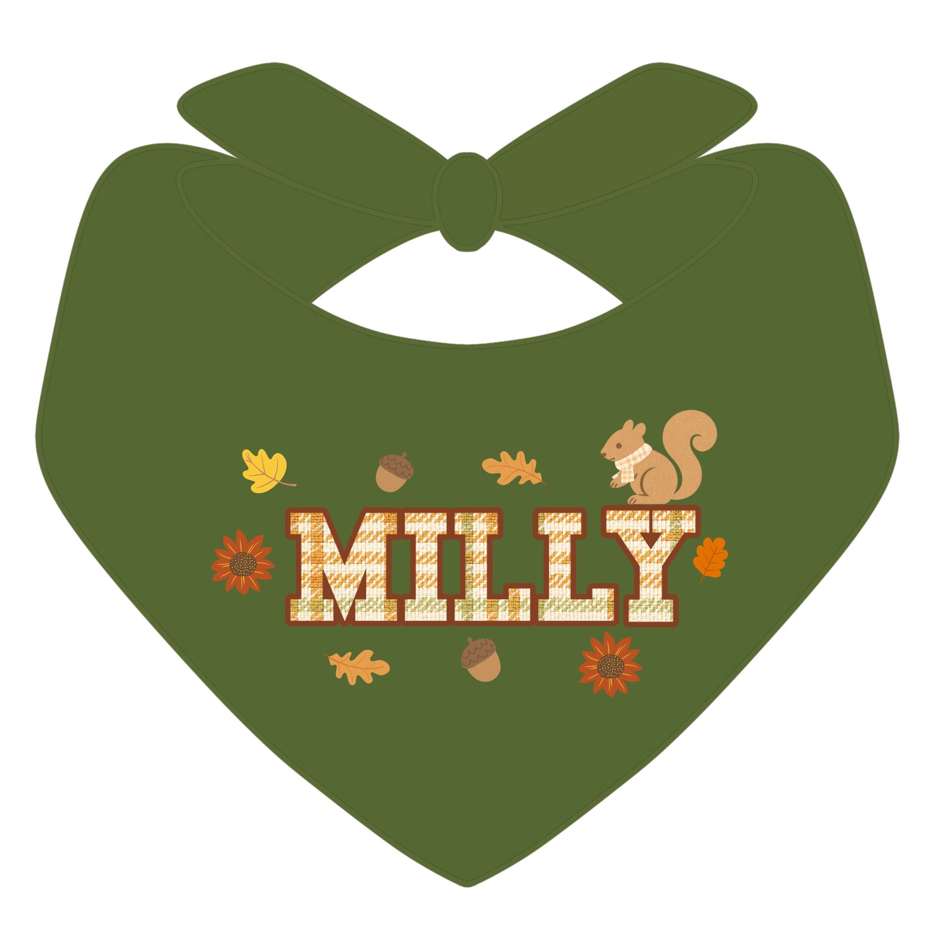Cozy + cute! This olive-green fall bandana features plaid lettering, golden leaves, acorns, sunflowers, and a little squirrel buddy 🐿️ — customized with your pup’s name. Perfect for pumpkin patch strolls, Thanksgiving walks, or cozy autumn photo shoots.