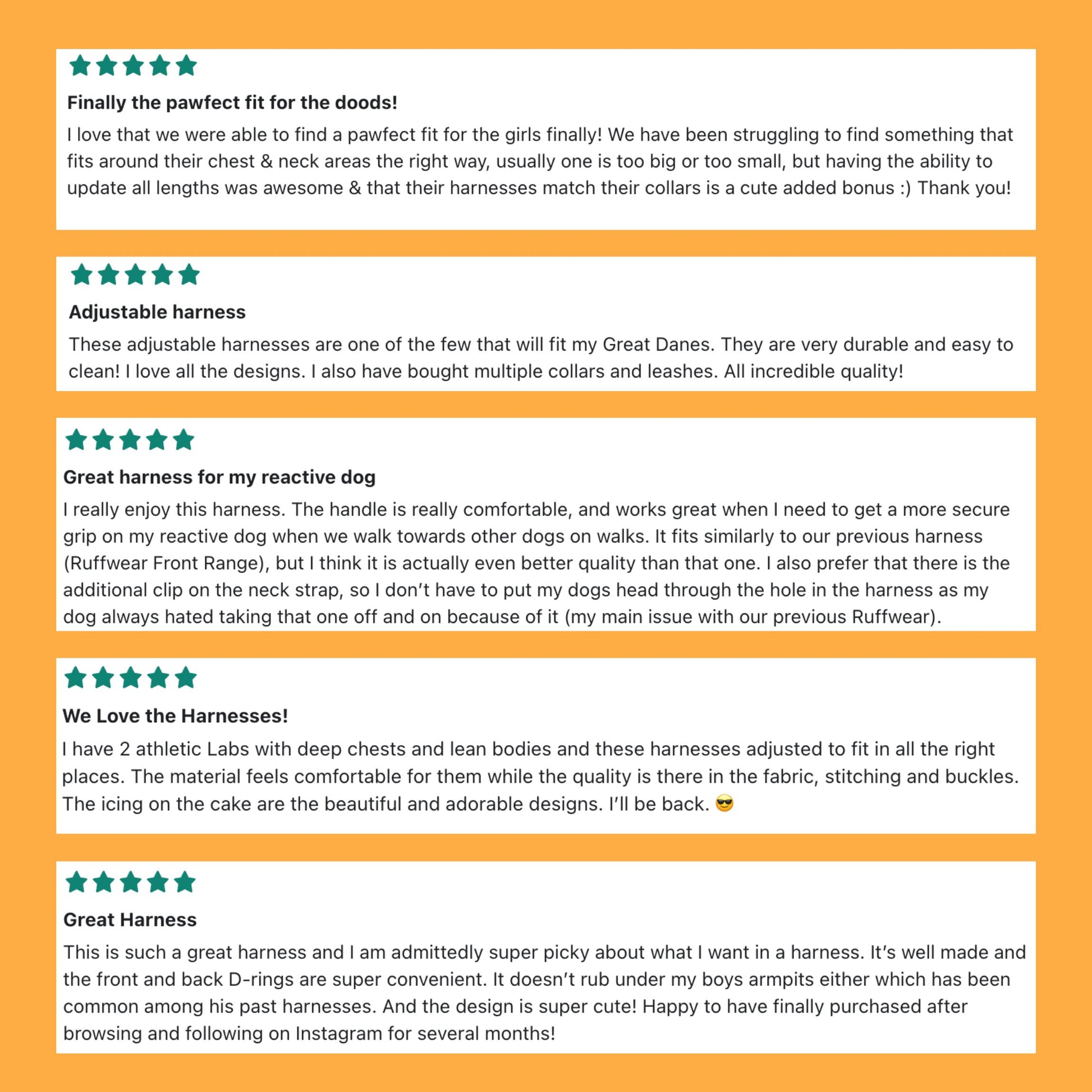 I love that we were able to find a pawfect fit for the girls finally! We have been struggling to find something that fits around their chest & neck areas the right way, usually one is too big or too small, but having the ability to update all lengths was awesome & that their harnesses match their collars is a cute added bonus :) Thank you!