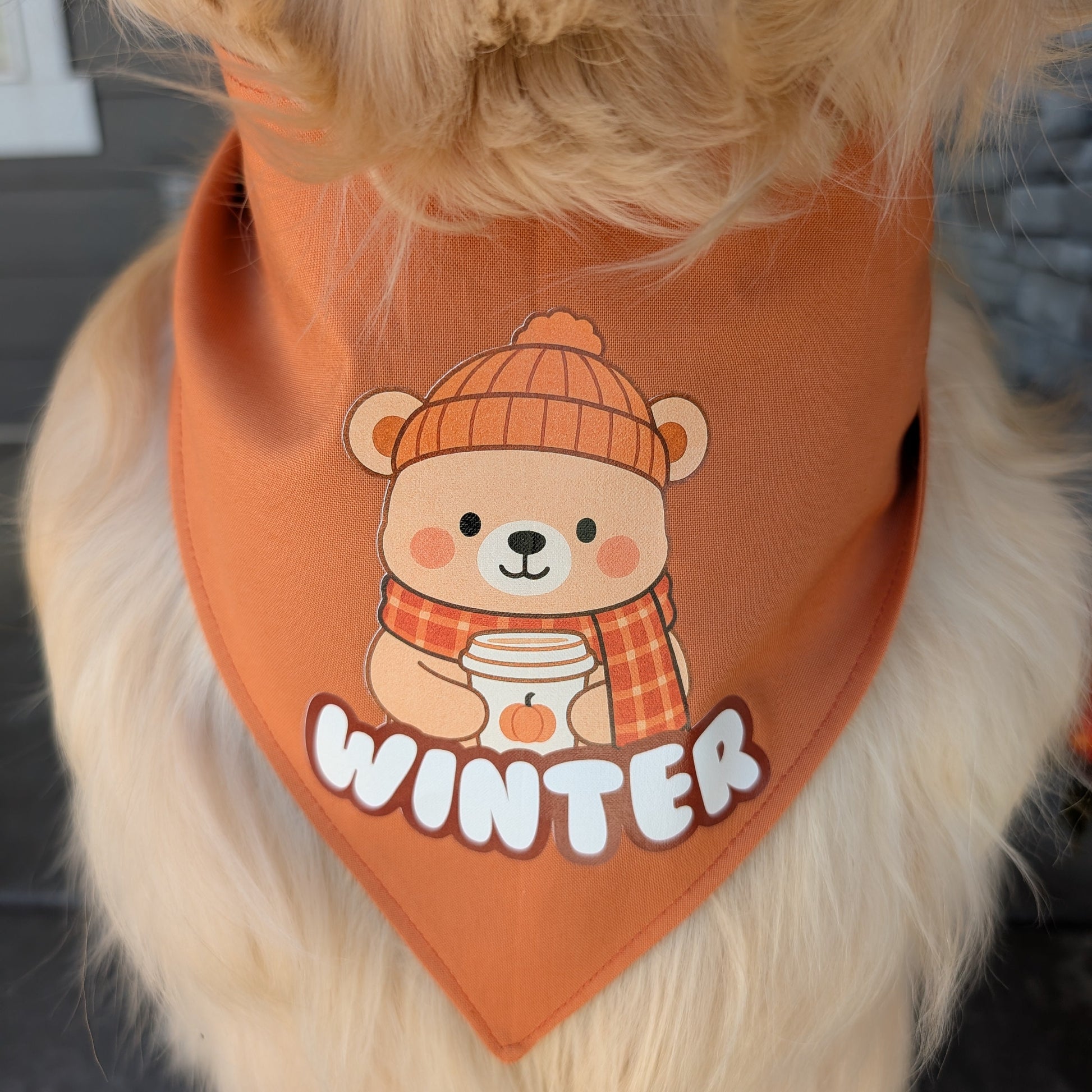 Pumpkin spice season isn’t just for humans anymore! This PSL-inspired dog bandana features a cozy bear in a beanie and plaid scarf holding a pumpkin spice latte — complete with your pup’s name. Perfect for autumn photos, pumpkin patch outings, and showing off your dog’s love of fall.