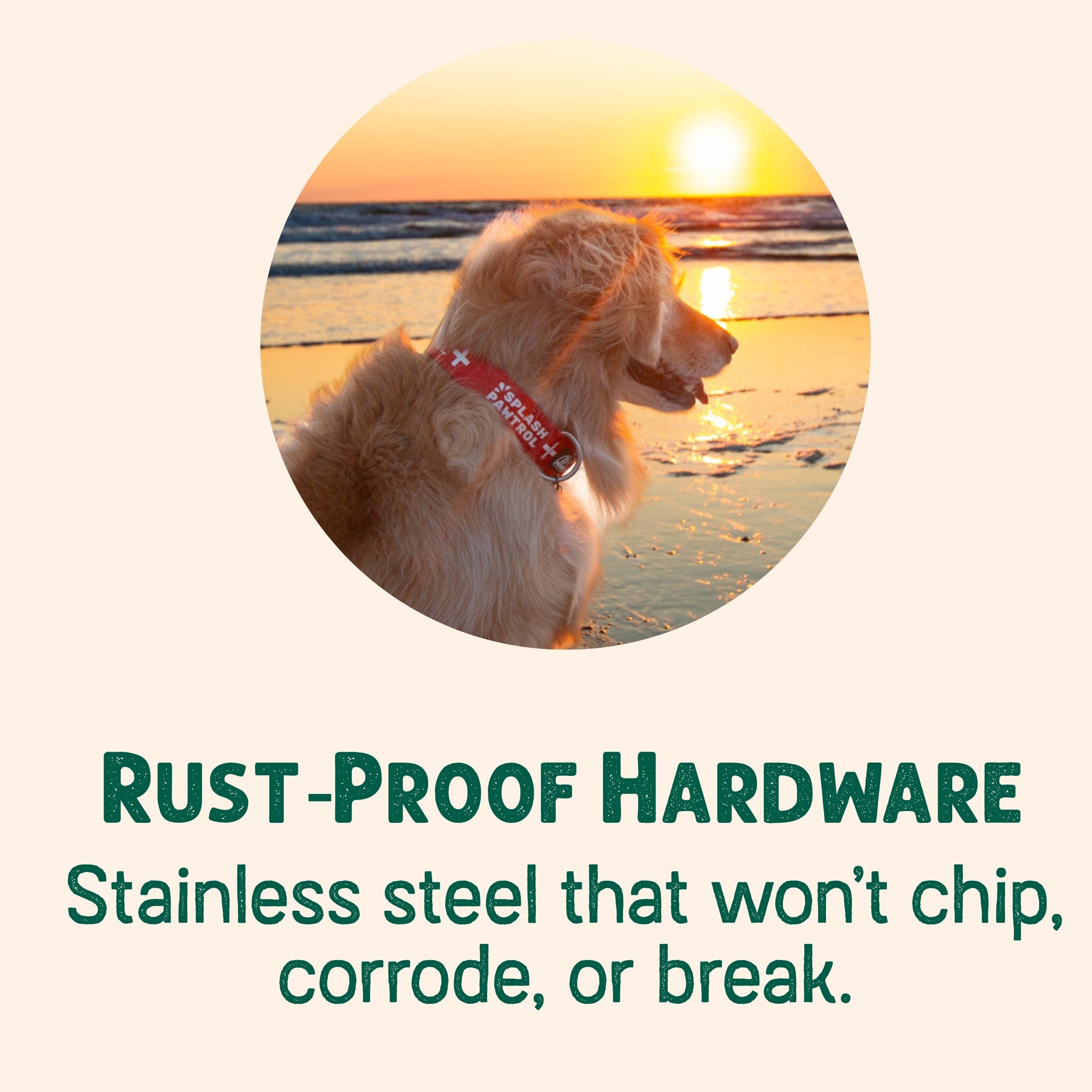 Wildside collars are different. Our soft, quick-drying polyester webbing moves naturally with your dog for all-day comfort, and our 100% rust-proof stainless-steel hardware never corrodes — no matter how many swims, rainy walks, or beach days you share.