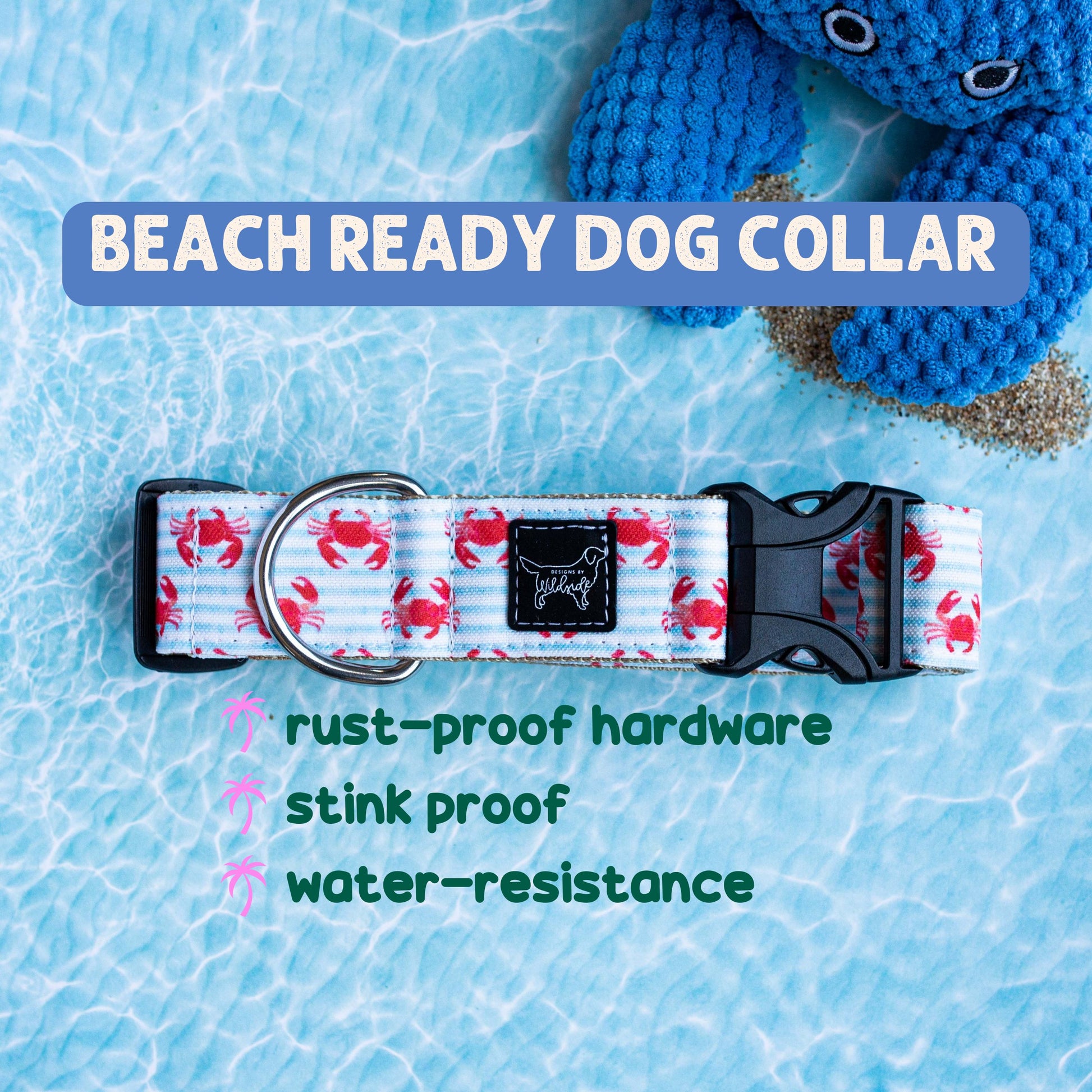 Our collars are crafted from tough, washable materials with rust-proof buckles, designed to last through daily walks, play, and outdoor adventures. Including swimming at the beach so your dog collar hardware will not rust.