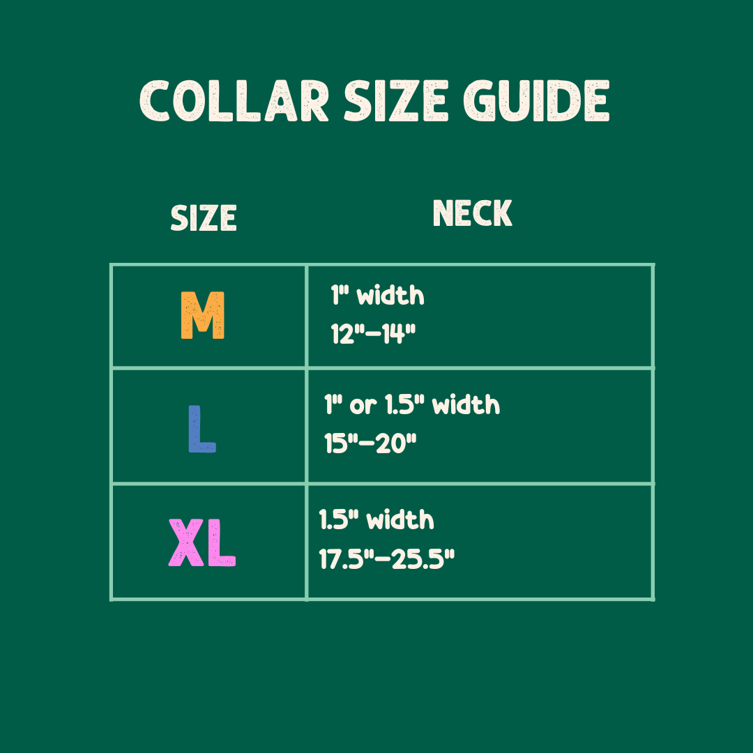 Use a soft tape measure around the base of your dog’s neck, adding 1–2 inches for comfort. Check our sizing chart for the best fit. If you need more help you can refer to our collar fit guide or instructional video.
