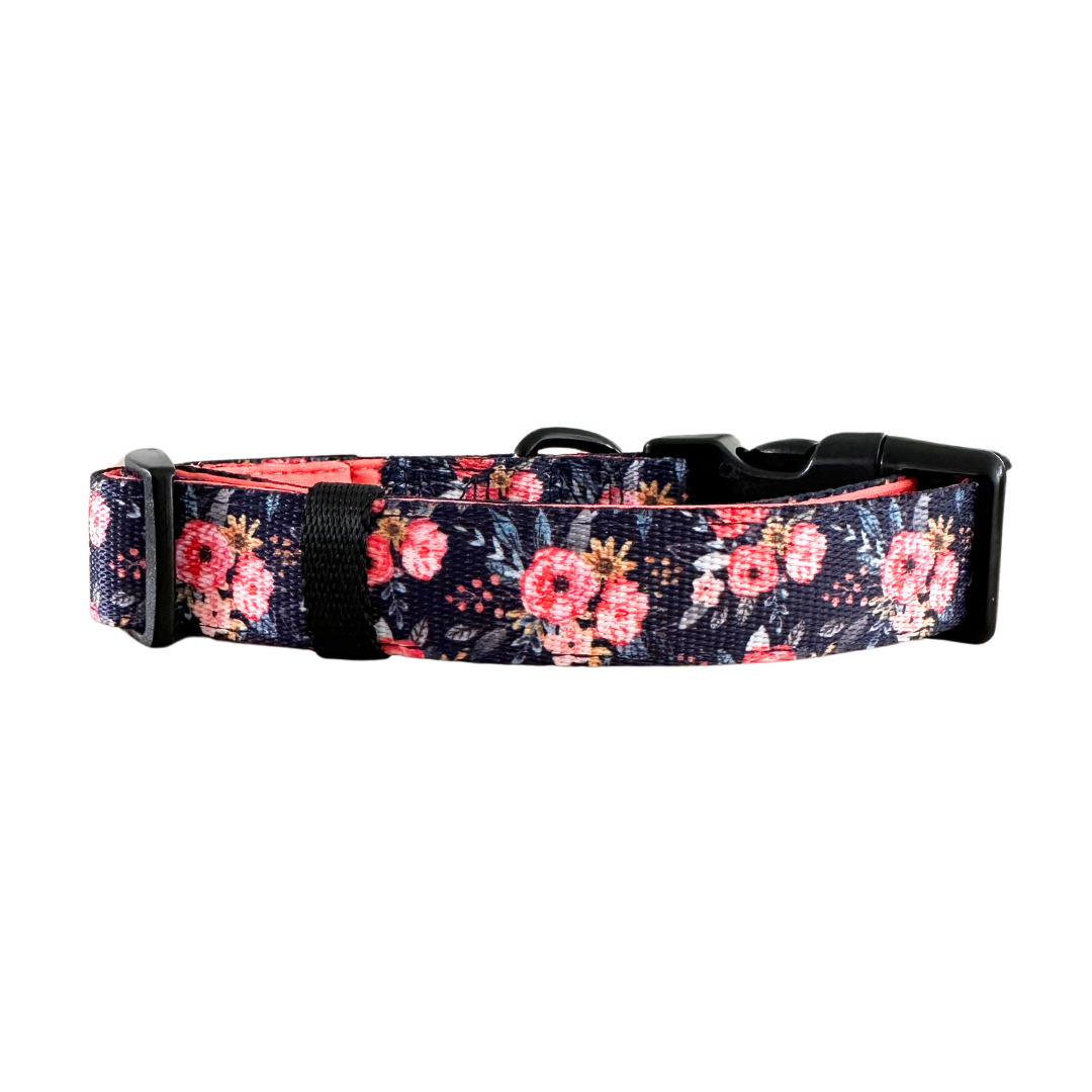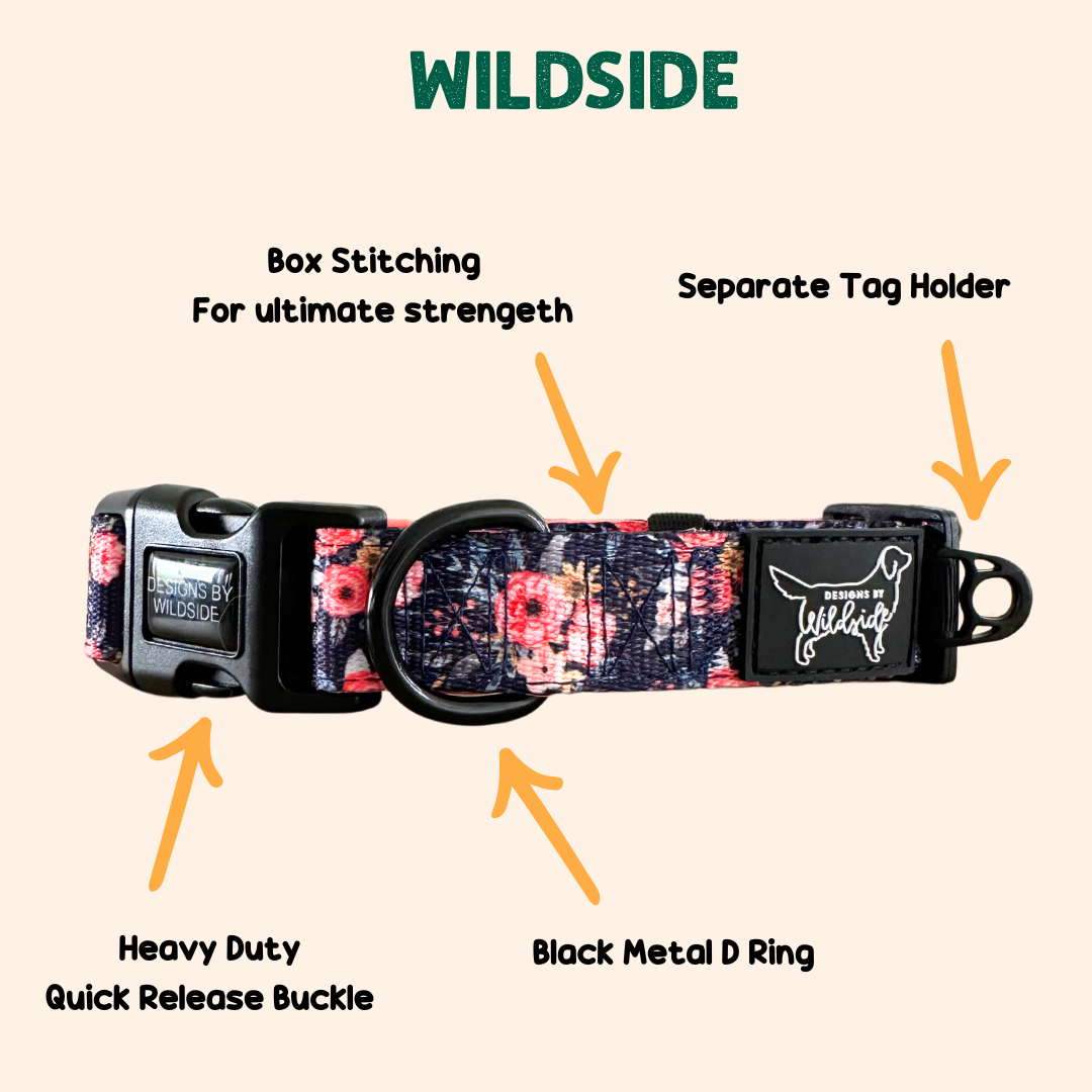 This adjustable dog collar features a soft, padded interior, providing a comfortable fit for your dog, whether they’re a small pup or a larger breed. The Wild Meadows collar is part of our collection of cute collars for dogs, perfect for adding a touch of elegance to your pet’s wardrobe. With its beautiful floral pattern, it’s one of the most trendy and fashionable dog collars available.